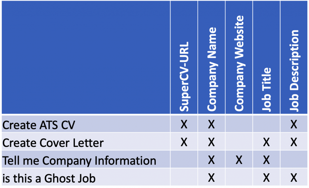 This tool will create you an AI Prompt which uses your SuperCv to create an ATS compliant CV specific for the role you are applying for. By selecting a different radio button you can also create a prompt to create a cover letter, give you company information or assess if the job is a ghost job.