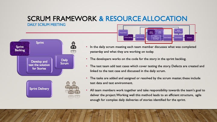 •The test team add test cases which cover testing the story. Defects are created and linked to the test case and discussed in the daily scrum.