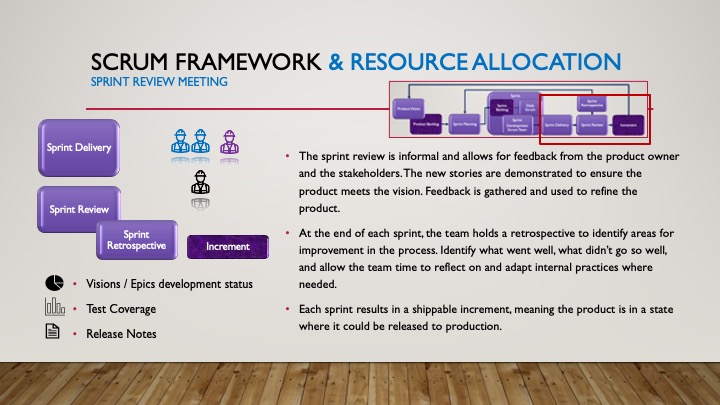 •The sprint review is informal and allows for feedback from the product owner and the stakeholders. The new stories are demonstrated to ensure the product meets the vision. Feedback is gathered and used to refine the product.