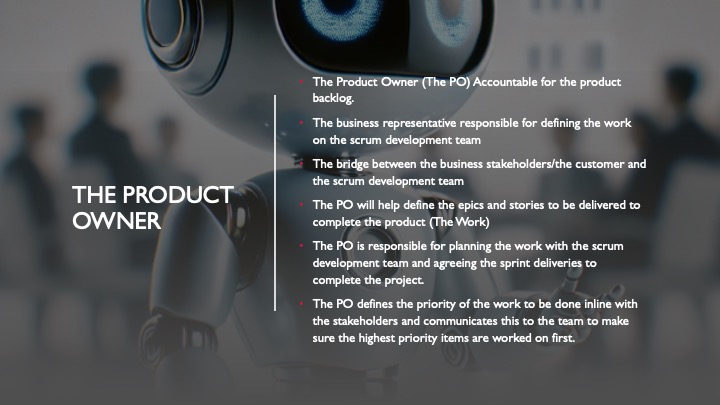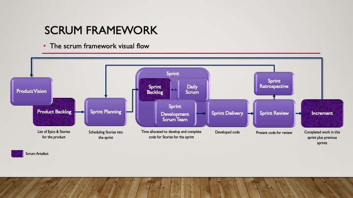 •The Product Backlog – a prioritised lists of work (epics, stories and tasks) that could be done for the product. The product back log is managed by the PO and is the single source of work for the development team.