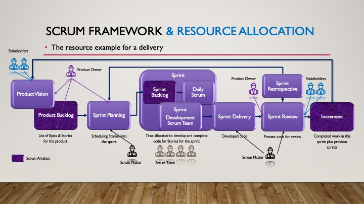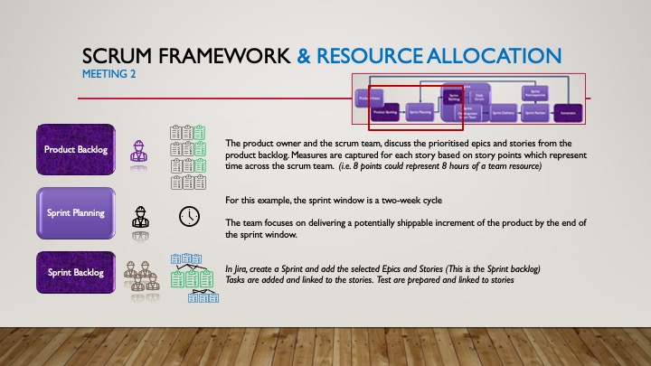 The product owner and the scrum team, discuss the prioritised epics and stories from the product backlog. Measures are captured for each story based on story points which represent time across the scrum team. (i.e. 8 points could represent 8 hours of a team resource)