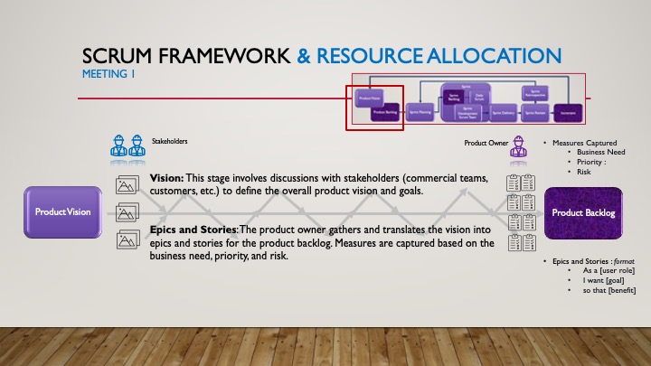 Epics and Stories: The product owner gathers and translates the vision into epics and stories for the product backlog. Measures are captured based on the business need, priority, and risk.