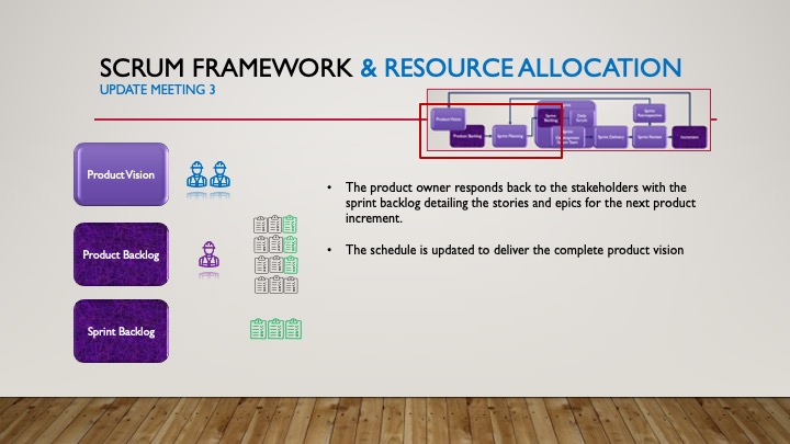 •The product owner respond back to the stakeholders with an updated product backlog and sprint backlog detailing the stories and epics for the next product increment.
